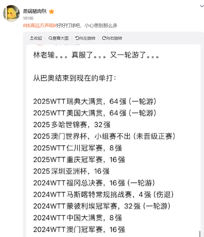 有球迷觉得林高远应该好好打球,因为林高远的个人竞技状态是差到极致,最近两次大满贯都是64强一轮游,2025年多哈世锦赛止步32强,2025年澳门世界杯没有晋级正赛,整个2025年度林高远最好的成绩仅仅是8强。
