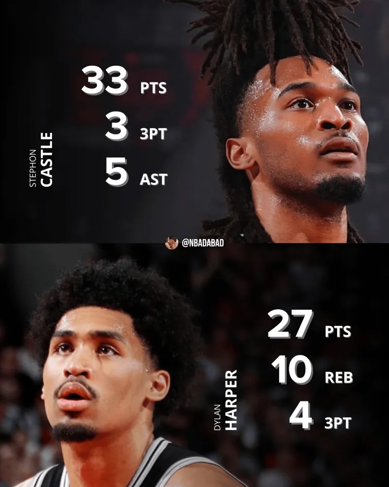 马刺球员哈珀出战30分钟,12投9中得到27分10篮板3助攻1抢断1盖帽。斯蒂芬-卡斯尔出战34分钟,18投10中得到33分2篮板5助攻1抢断。